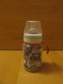 Die Flasche ist prall gefüllt mit Leckereien, Deko und Teelichtern. Ich habe mich wirklich sehr gefreut und musste darüber sehr schmunzeln.